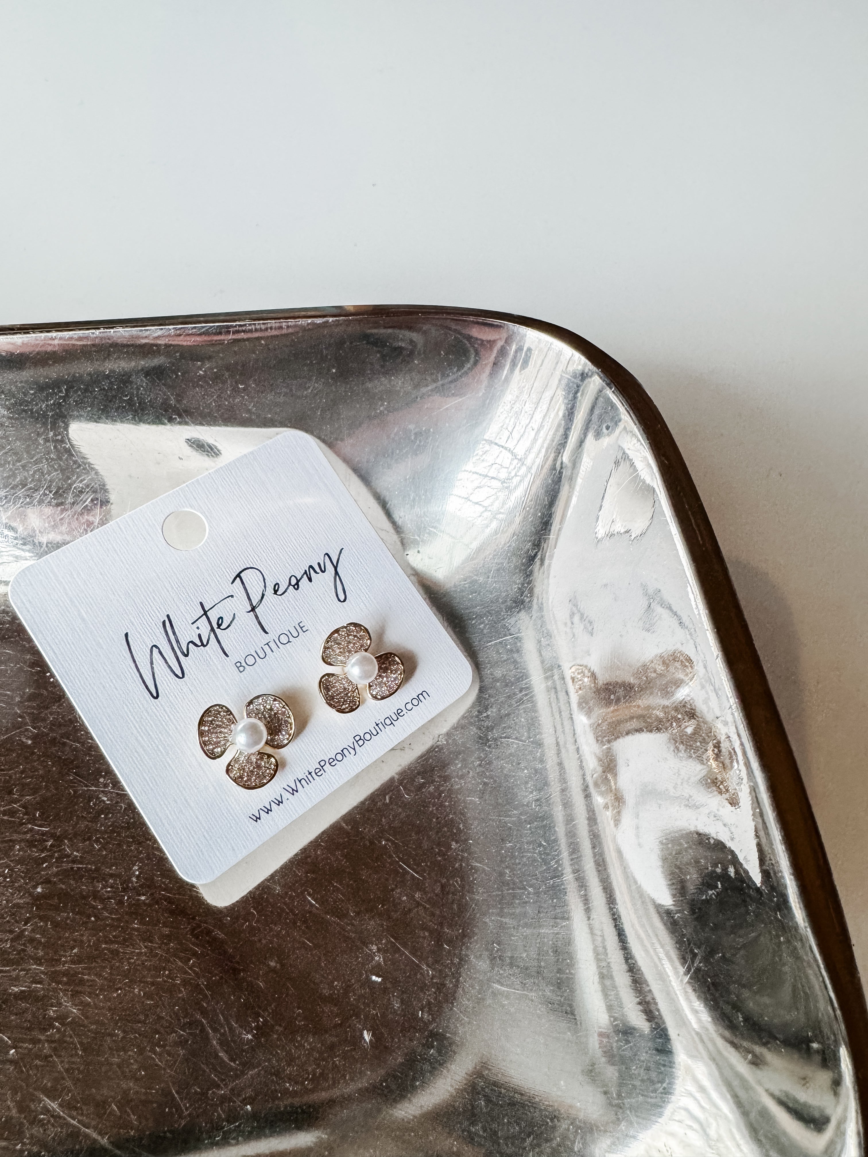 This elegant pearl stud is delicately surrounded by small pave leaves, adding a touch of sophistication to any outfit. The intricate design showcases expert craftsmanship, making it a timeless addition to your jewelry collection. Elevate any look with this stunning piece.