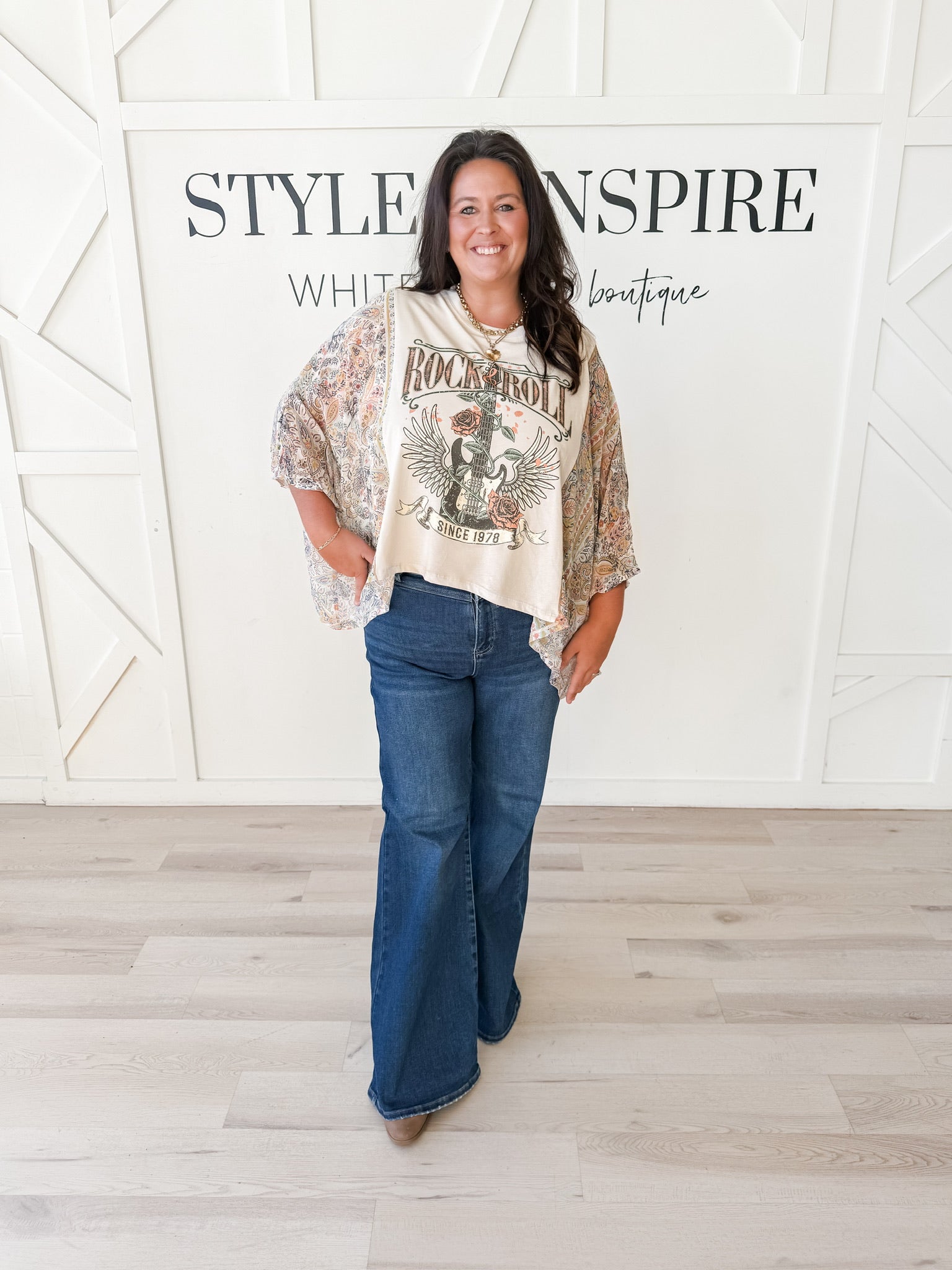 Style: This Rock N Roll Leopard Graphic Kantha Top features a crew neck and striking guitar and dual leopard graphics that bring bold style to your wardrobe. Designed with wide patterned sleeves and open sides, it offers a relaxed fit and breathable comfort. Crafted from lightweight fabric, this top is perfect for layering or wearing on its own in warmer weather. Its distinctive design blends edgy rock motifs with casual ease, making it a versatile statement piece for an expert fashion sense.