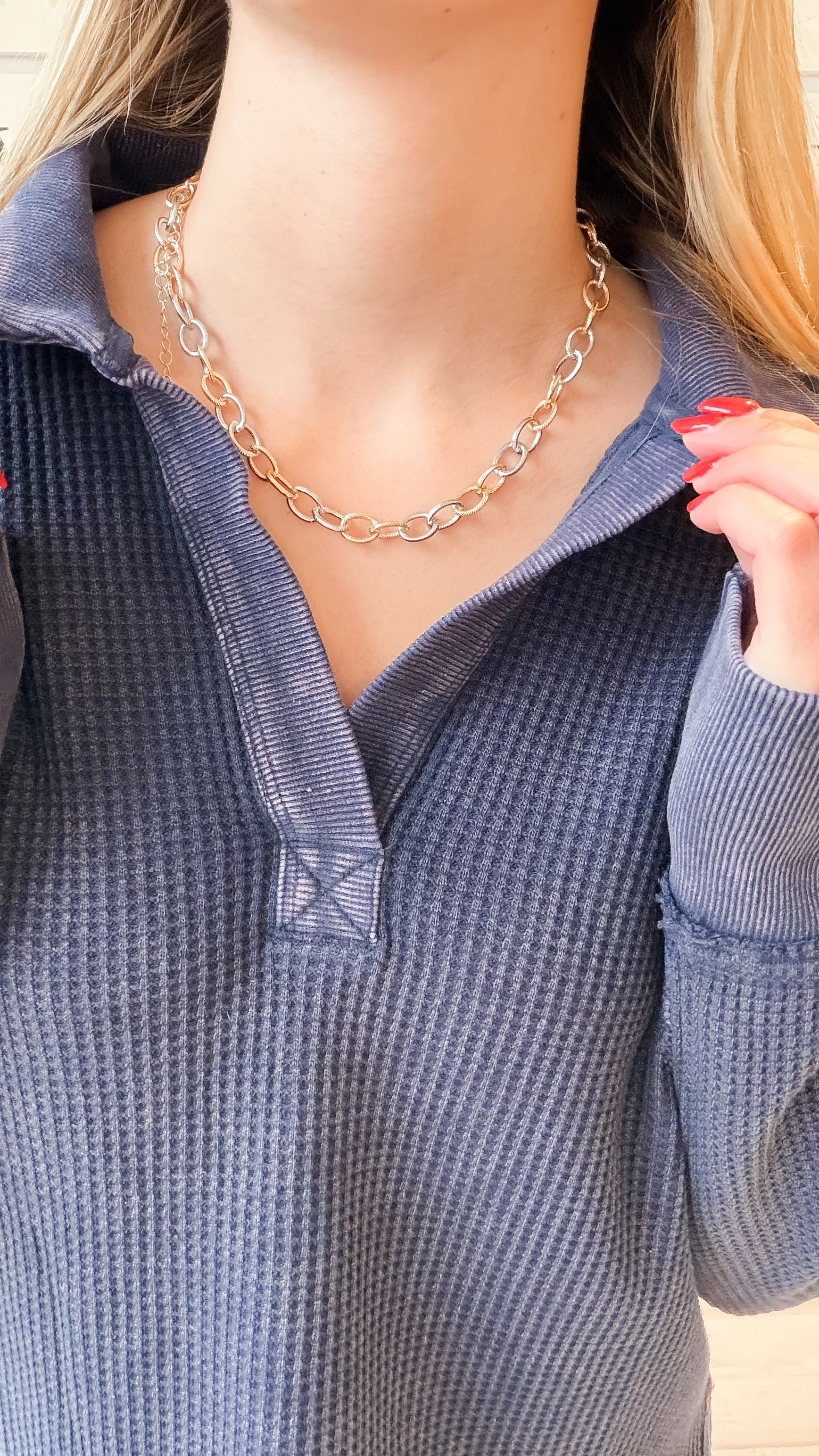 Style: The Sharon Washed Thermal Top features a shirt collar with a distinctive split V front, enhanced by contrast ribbing on the neckline and cuffs for subtle detailing. Crafted from soft waffle knit fabric, this top offers comfortable breathability and texture. Its straight hem with side slits provides ease of movement and a tailored finish, making it a versatile layering piece for refined casual wear.