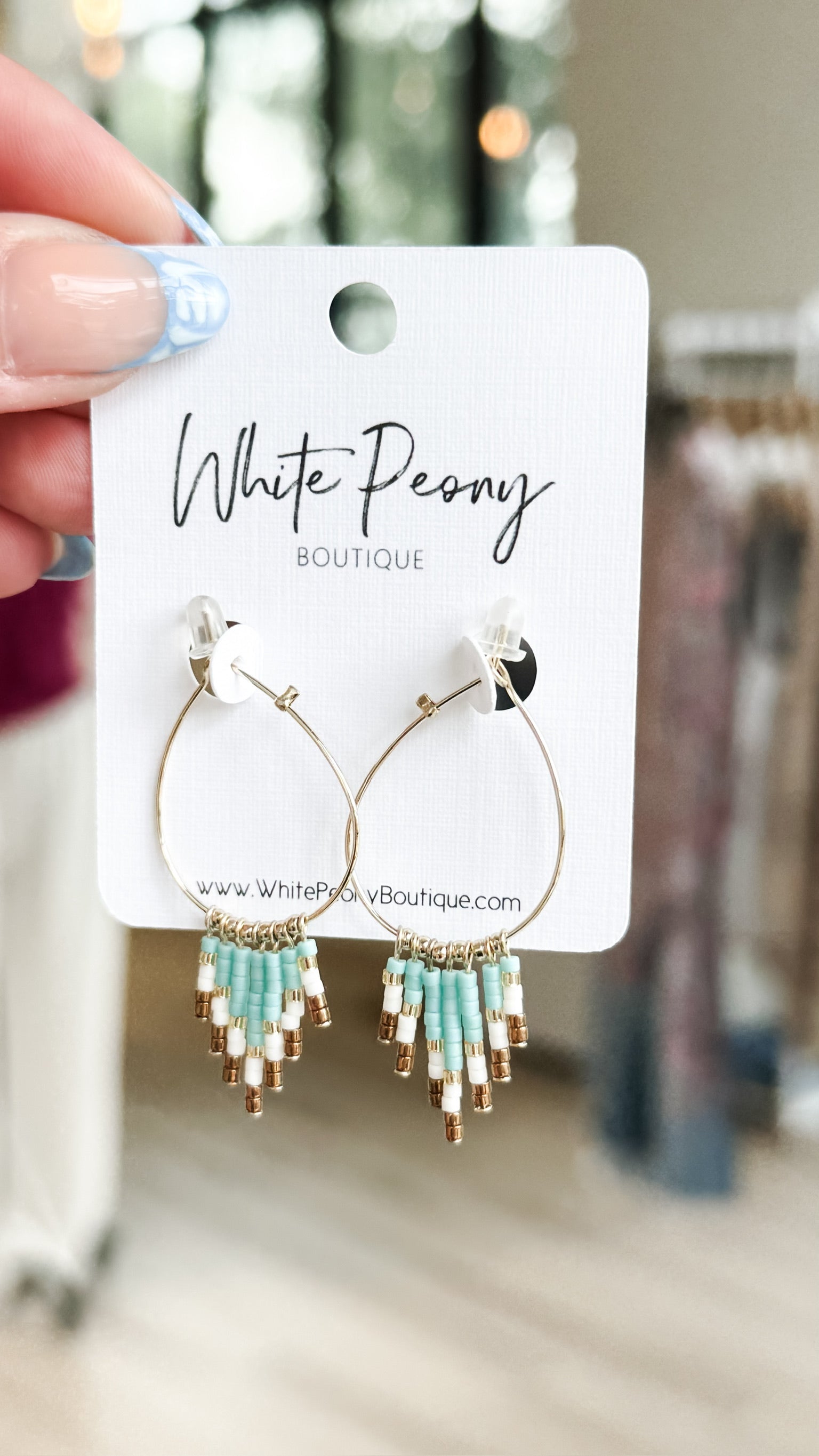 These teardrop hoop earrings add a playful pop of color and movement with cascading fringe made from tiny glass seed beads. Lightweight and full of personality, they bring a touch of boho charm to any look.