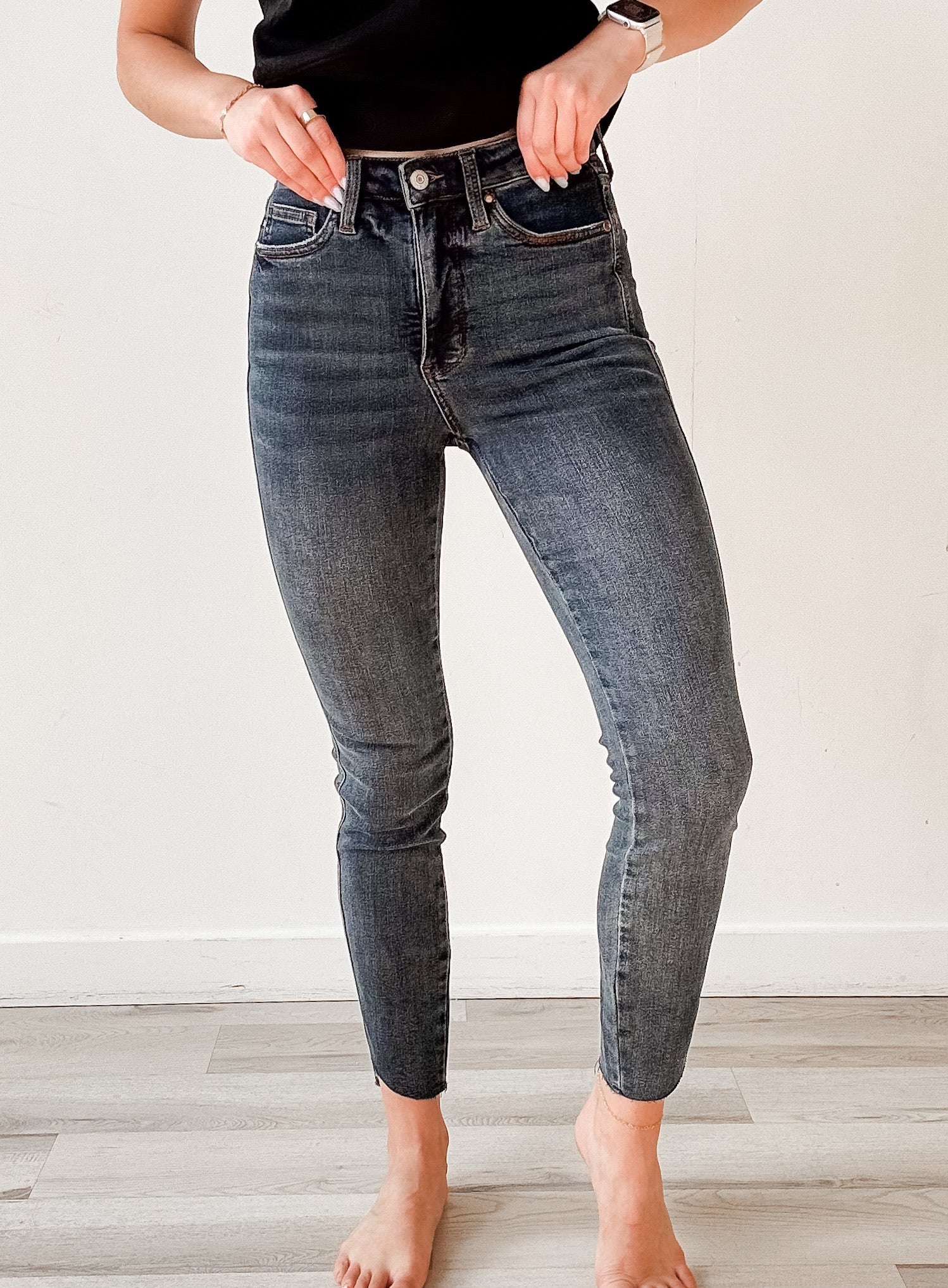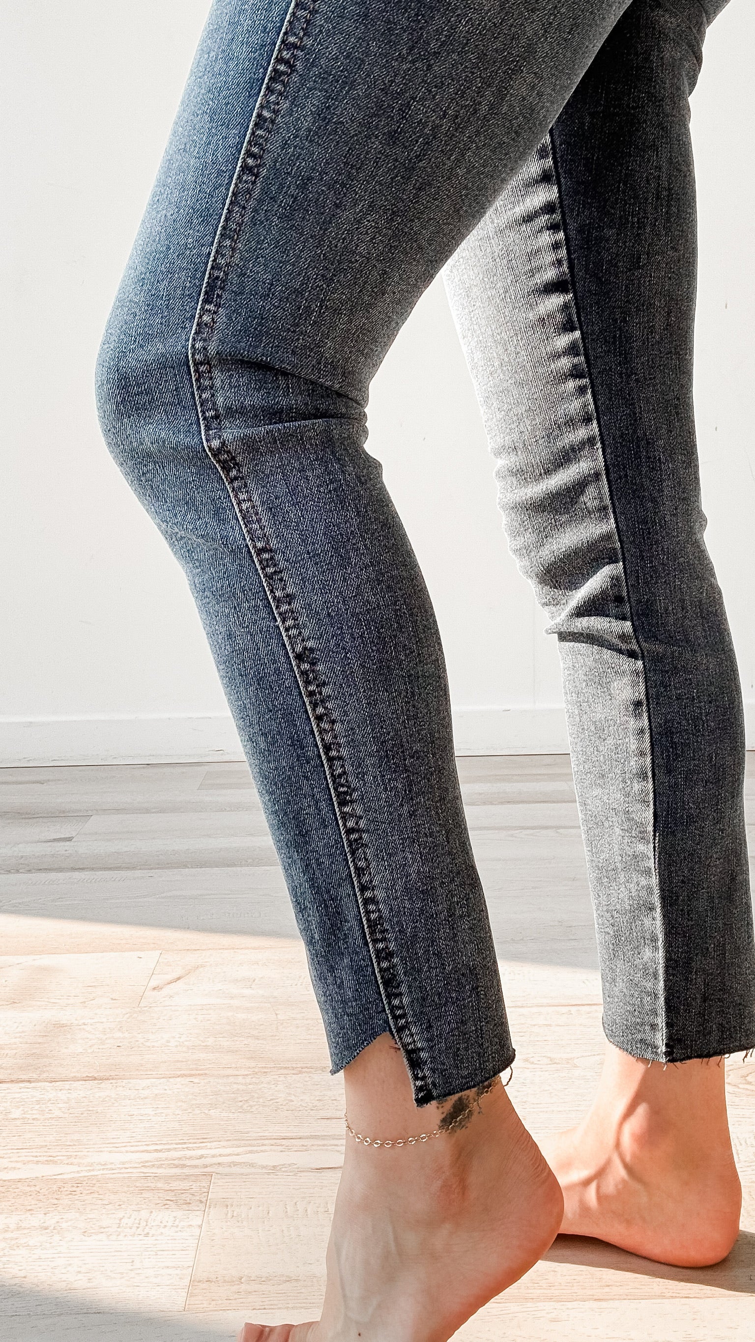Fit: 29" Inseam. High rise. Tummy control. Skinny leg. Raw step hem. No distressing.