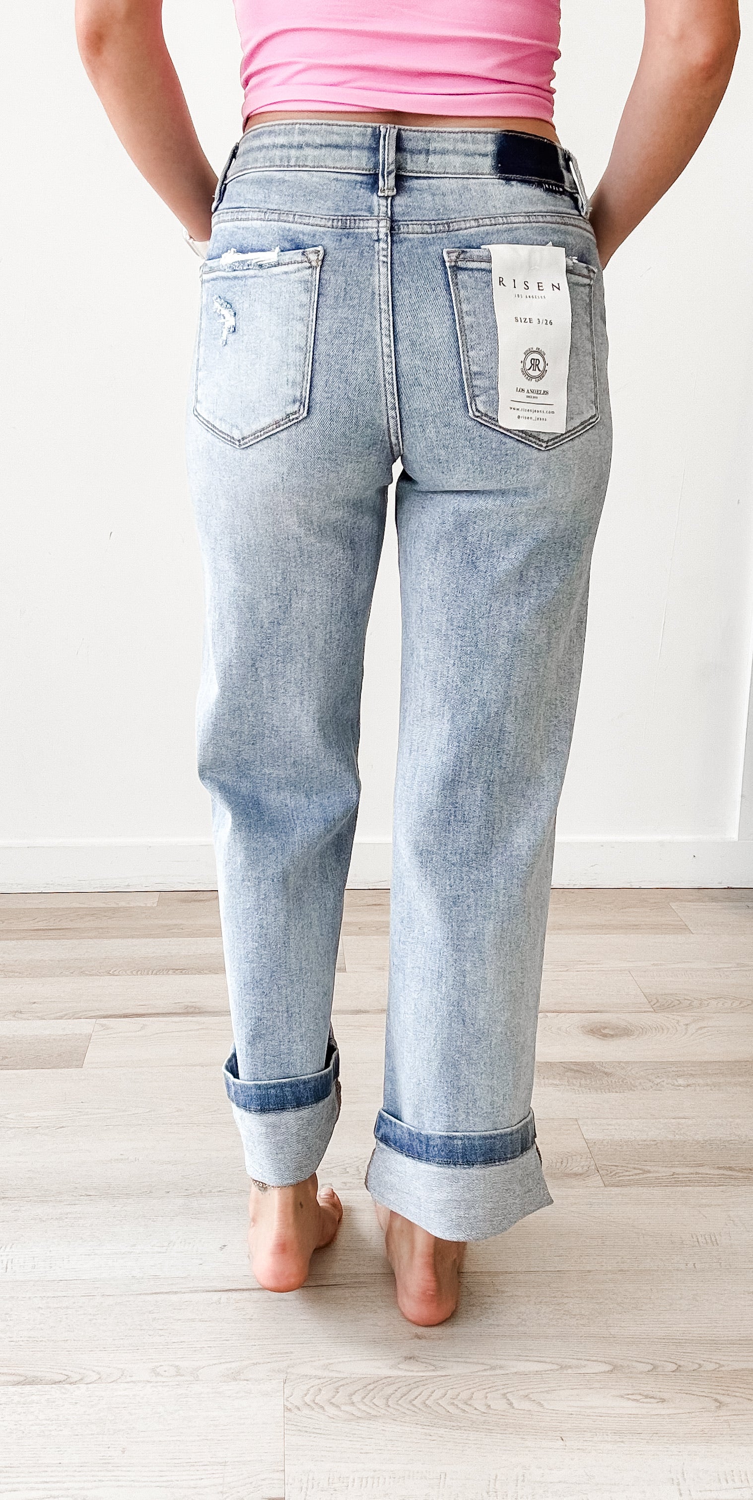 Style: These Risen mid-rise jeans feature a 32" inseam and a wide-leg silhouette designed for both style and comfort. Crafted with comfort stretch fabric, they offer gentle tummy control for a flattering fit. The light wash and slight distressing add a modern, worn-in look, making them a versatile addition to any wardrobe.