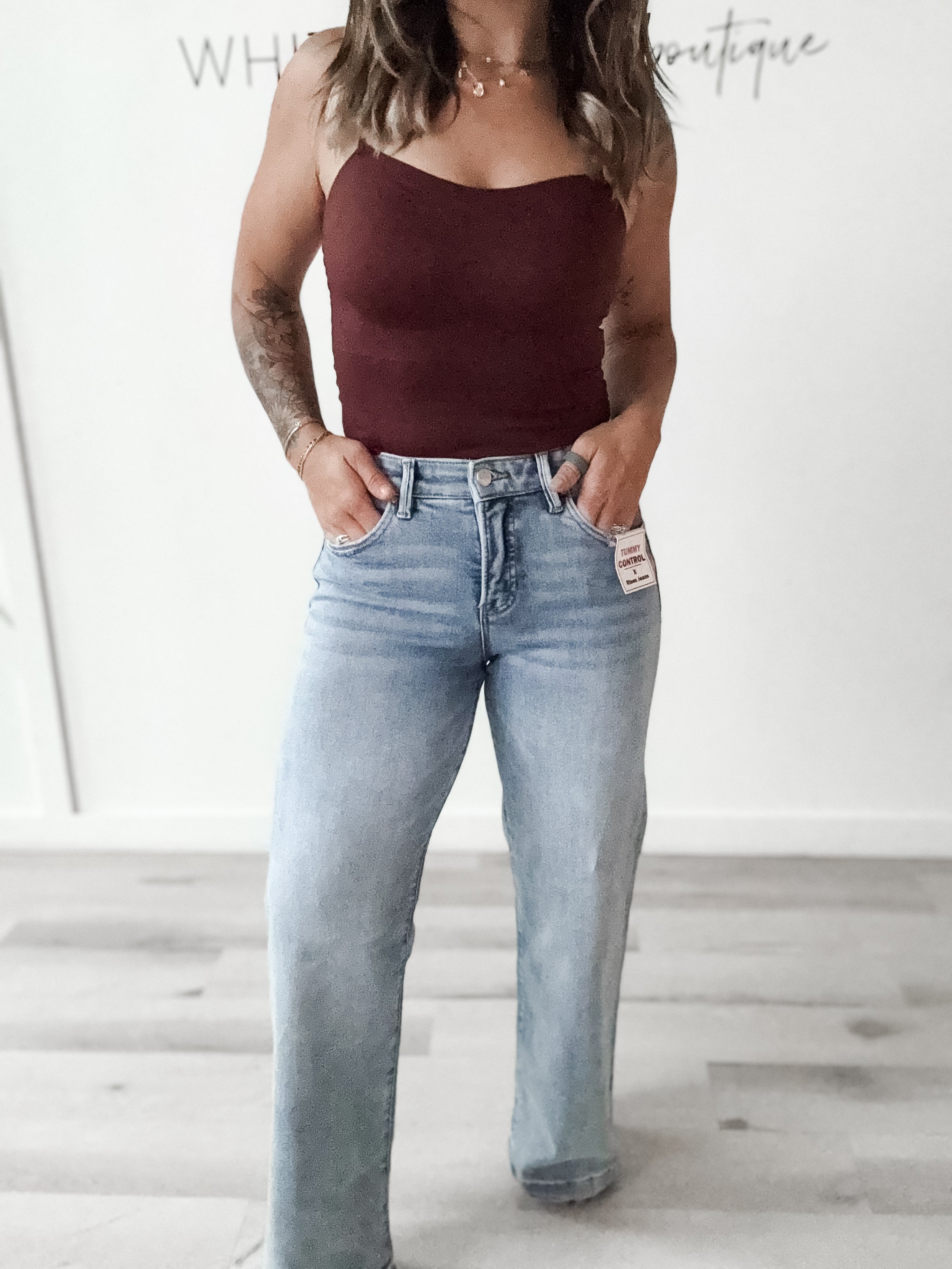 Fit: 32" Inseam. Mid-Rise. Tummy Control. Wide leg. Slight distressing. Comfort stretch. Light wash.
